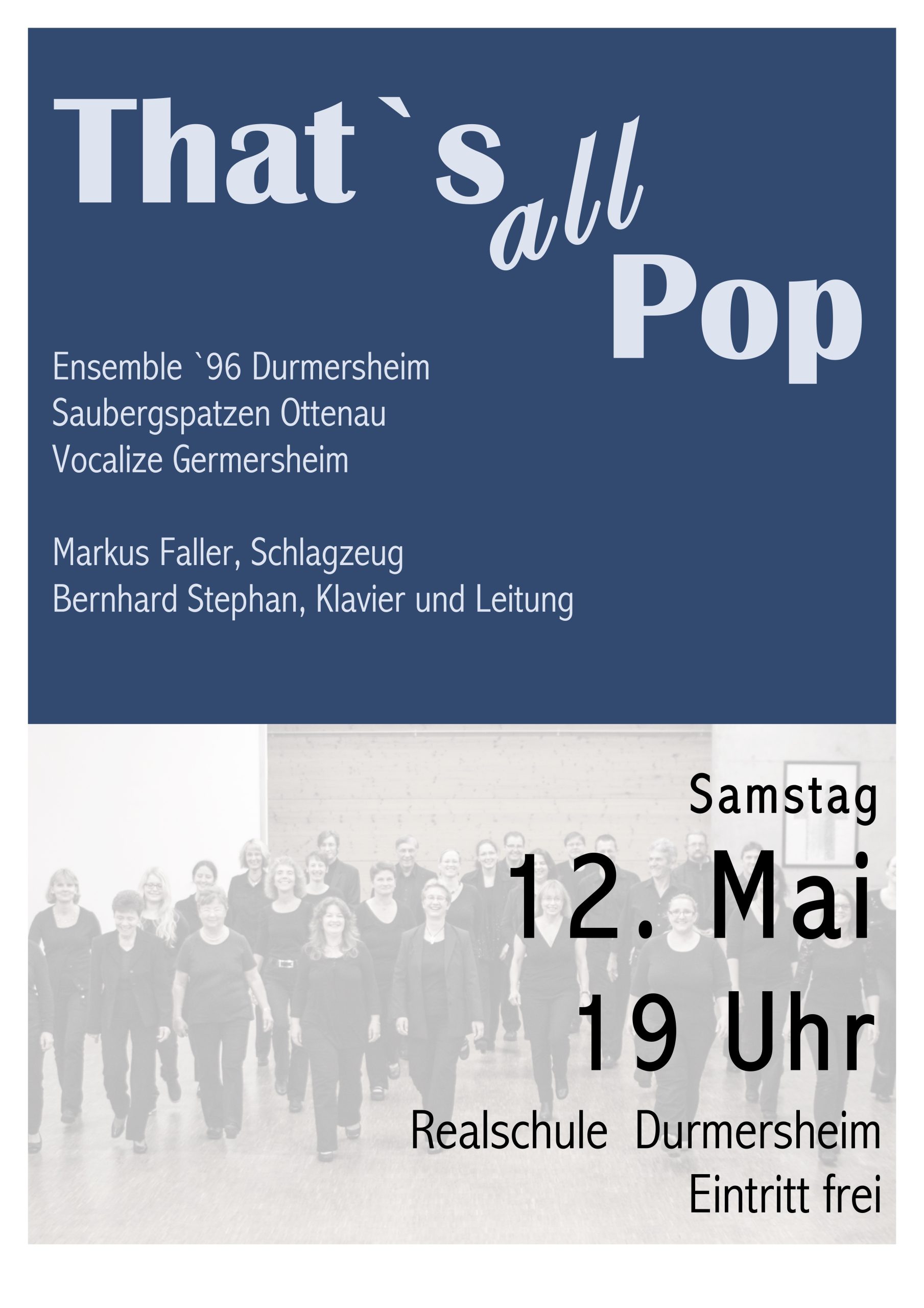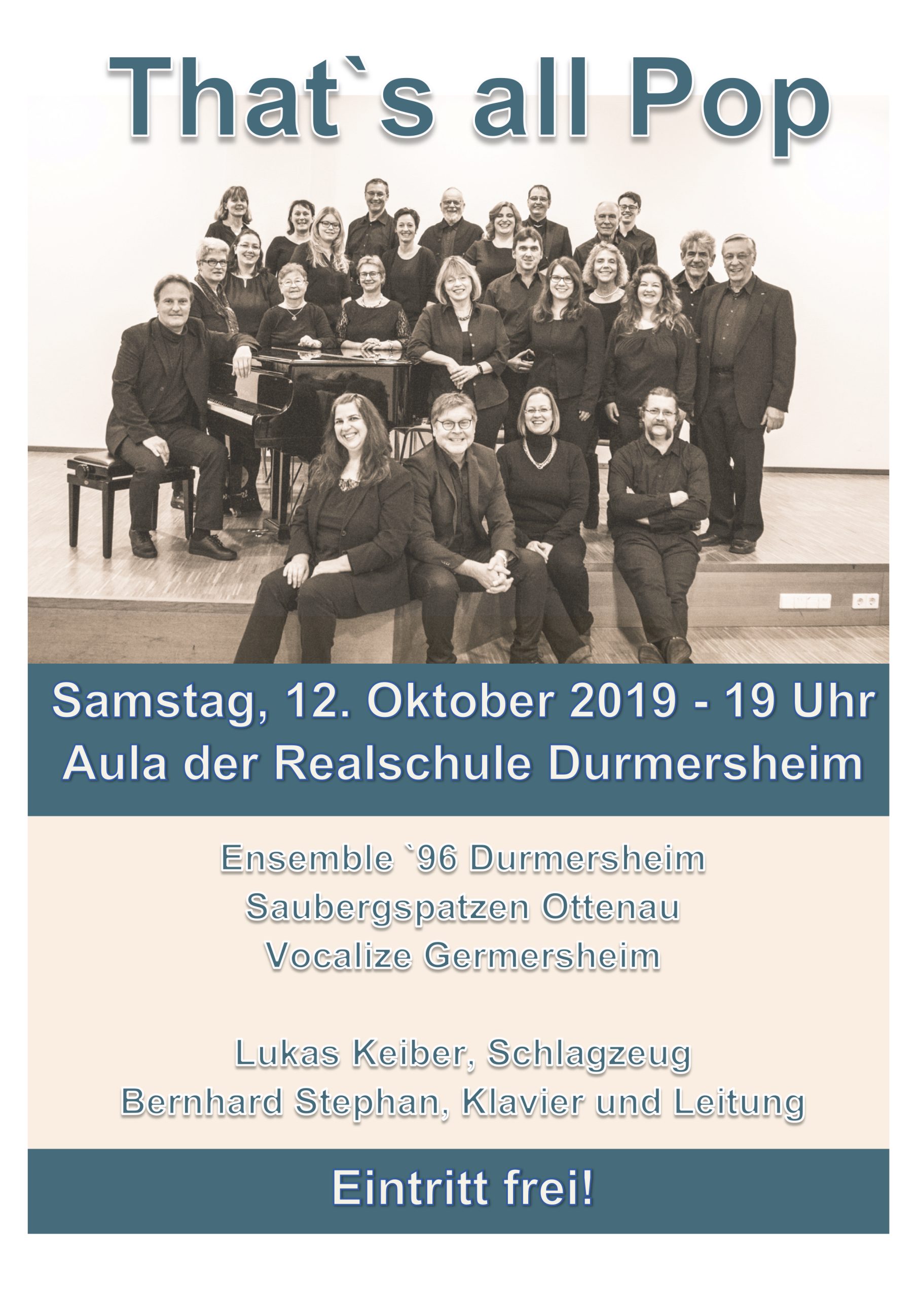 Auch 2026 heißt es bei uns wieder: That’s all Pop! Unser Kammerchor bringt im Herbst erneut Pop-, Rock- und Musical-Hits der letzten Jahrzehnte auf die Bühne. Die frischen, anspruchsvollen und mehrstimmigen Chorfassungen arrangiert unser Chorleiter und Dirigent Bernhard Stephan. Freut euch auf bekannte Hits und überraschende Neuentdeckungen.
